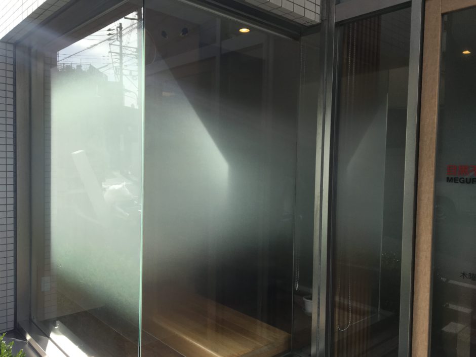 施工後の窓ガラス。商業施設なため、完全に内部を見えなくするのではなく、お客様の顔や目線の位置のみ隠れるグラデーションタイプをセレクト。