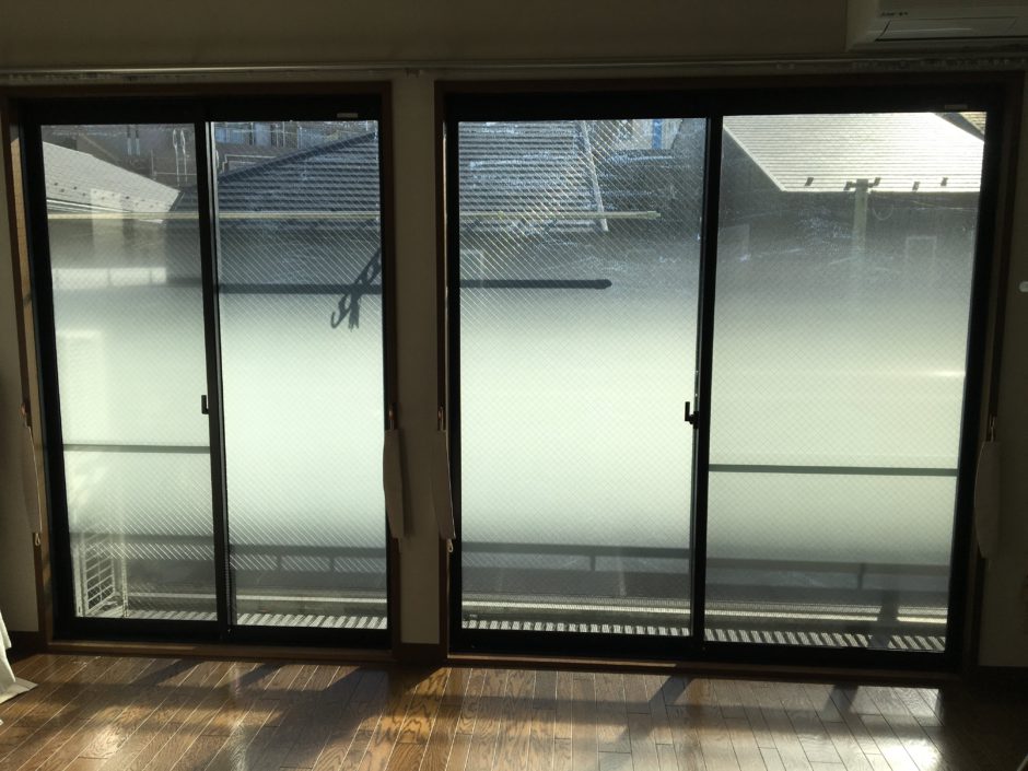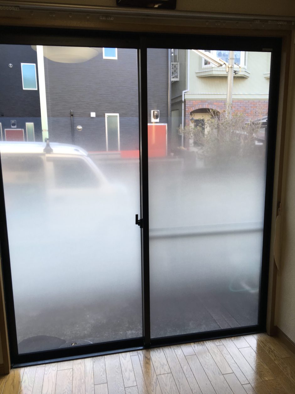 施工後のリビング窓。グラデーションタイプの目隠しフィルムを貼ることで、車だけが見えにくくなるようになりました。