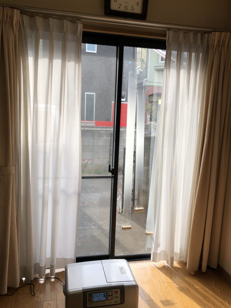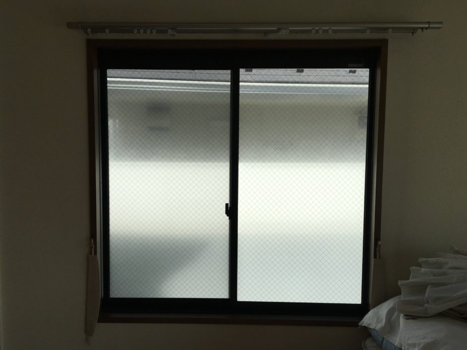 曇り面の多いすりガラスを貼ることで、日中は窓上部からは十分に日光が差し、一方で通行人からの視線を心配することなく寝ることができるようになりました。