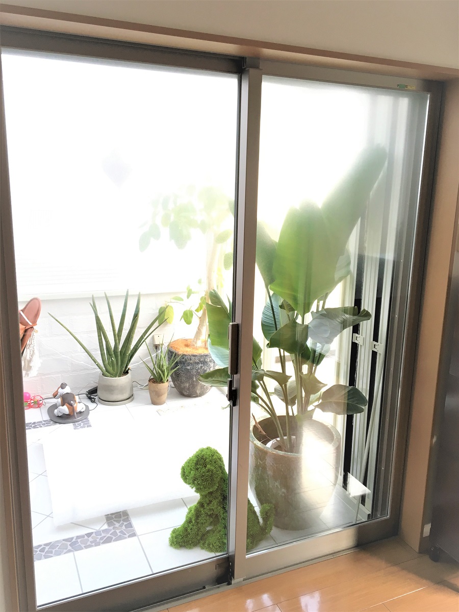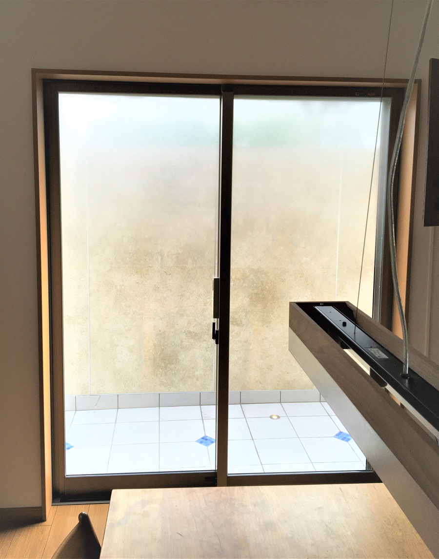 ‍住居の掃き出し窓目隠しフィルムを貼付。