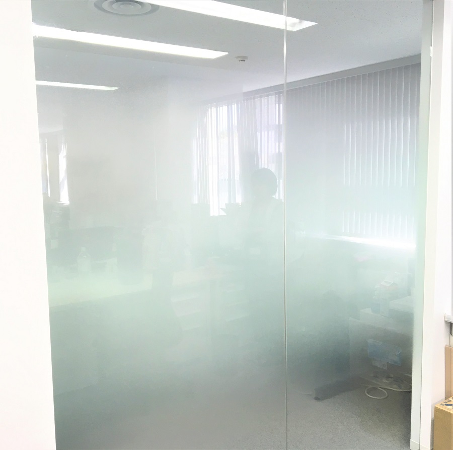 ‍オフィス仕切りのガラス窓に目隠しフィルムを貼り付け。