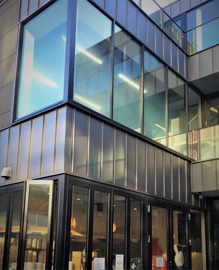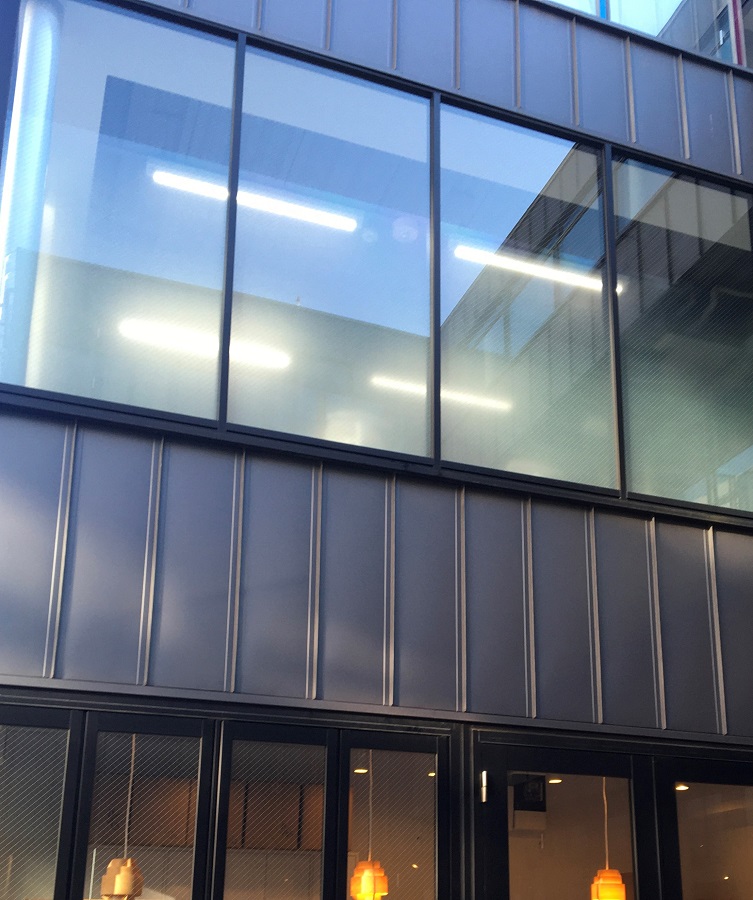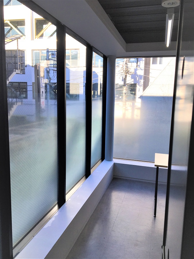 ‍ビル2階の事務所の窓にグラデーションタイプの目隠しフィルムを貼付け。