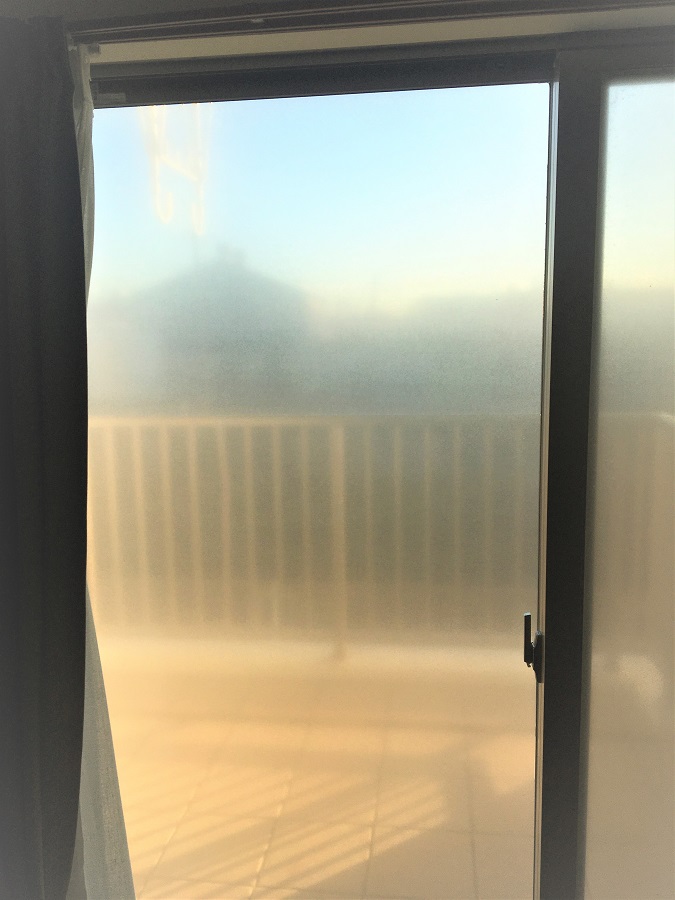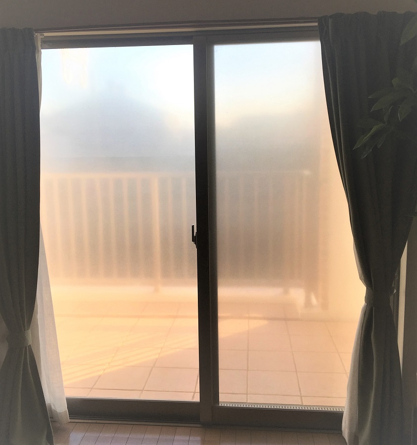‍住居居室の掃き出し窓に目隠しフィルムを貼り付け。