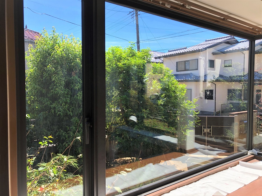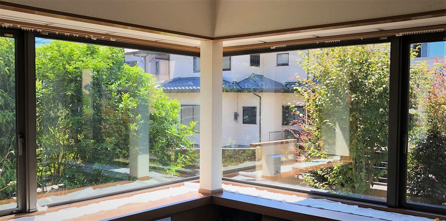 ‍戸建て住宅の居室出窓にグラデーションタイプの目隠しフィルムを貼り付け施工。こちらは施工前の様子。