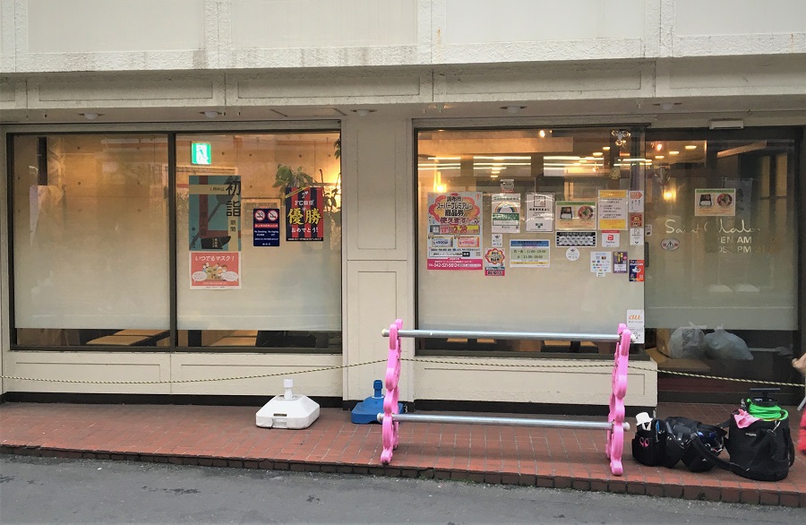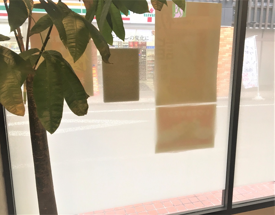 ‍商店街の店舗、路面のガラス部分にグラデーションタイプの目隠しフィルムを貼付け。