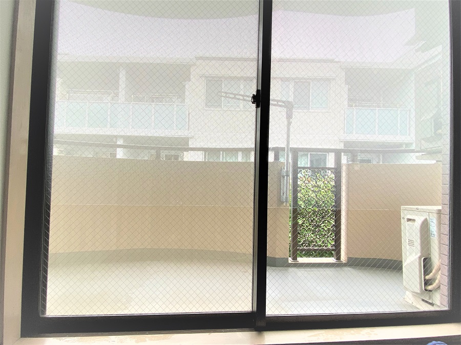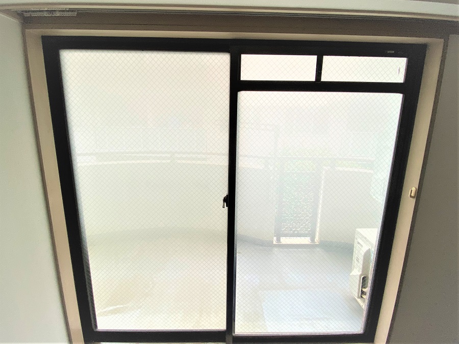 ‍マンションの居室窓に目隠しフィルムを貼付け。今回使用したフィルムは、3M社製の『イルミナ』です。