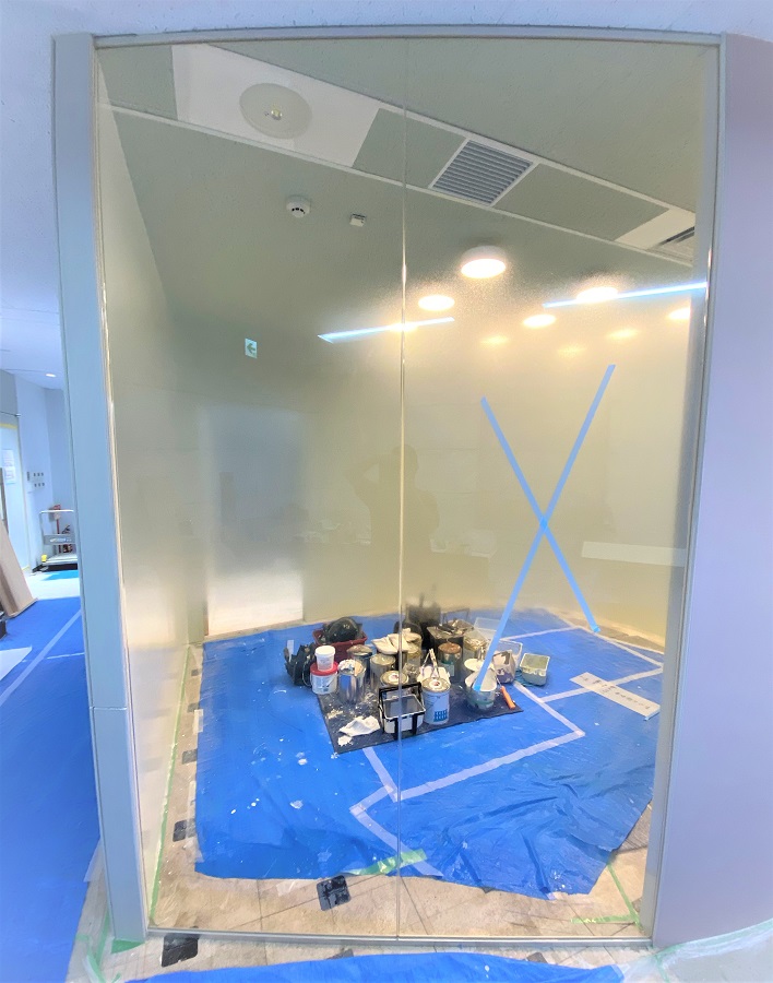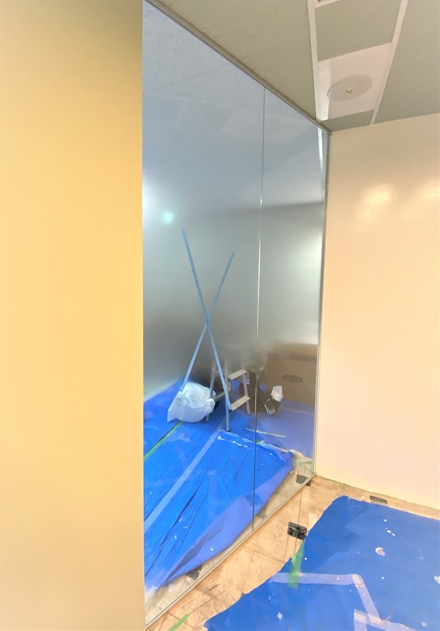 ‍建設中の施設、室内のフィクス窓にグラデーションタイプの目隠しフィルムを貼付け。