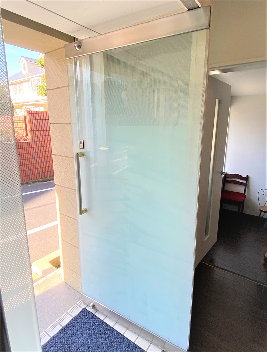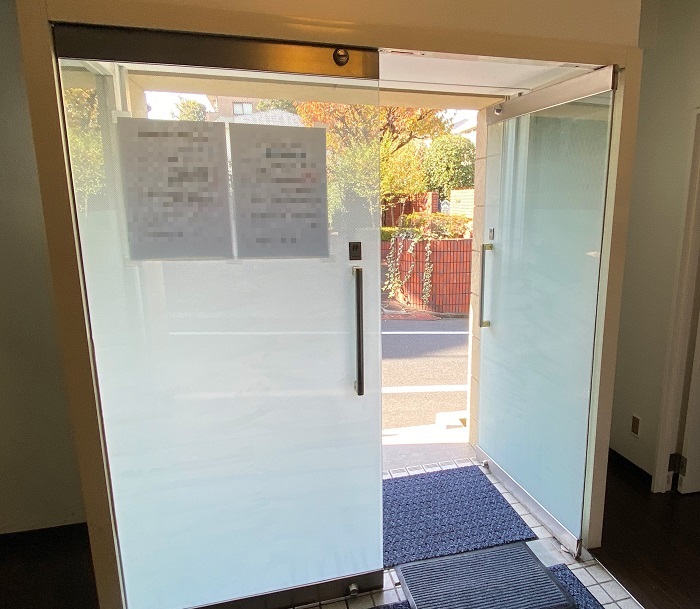 ‍施設入り口のガラス扉にグラデーションタイプの目隠しフィルムを貼り付け。