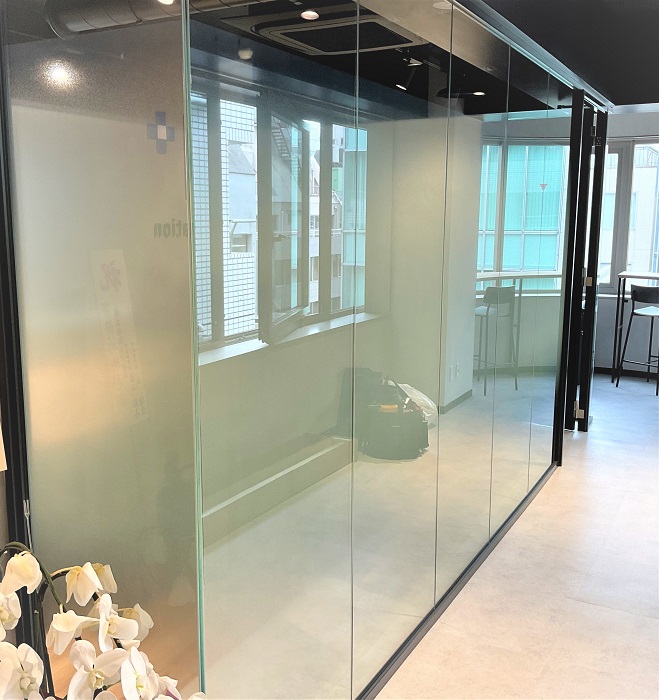 ‍オフィスの会議室のパーティションにグラデーションタイプの目隠しフィルムを貼付け。