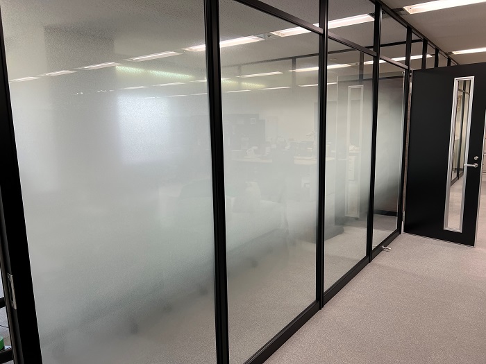 ‍オフィス内のパーティションに目隠しフィルムを貼付け。こちらは施工前の様子。