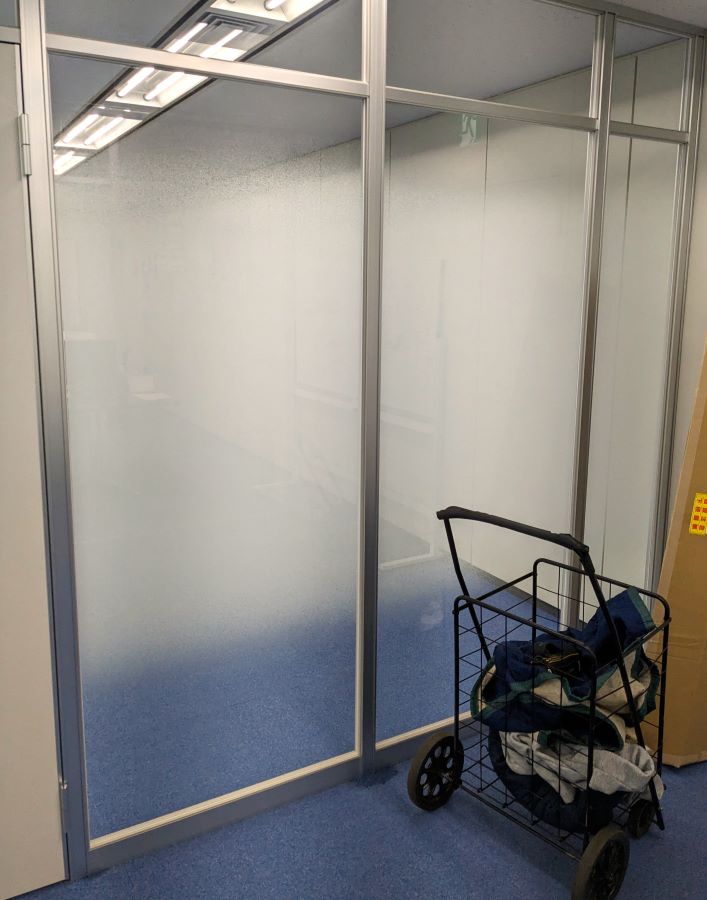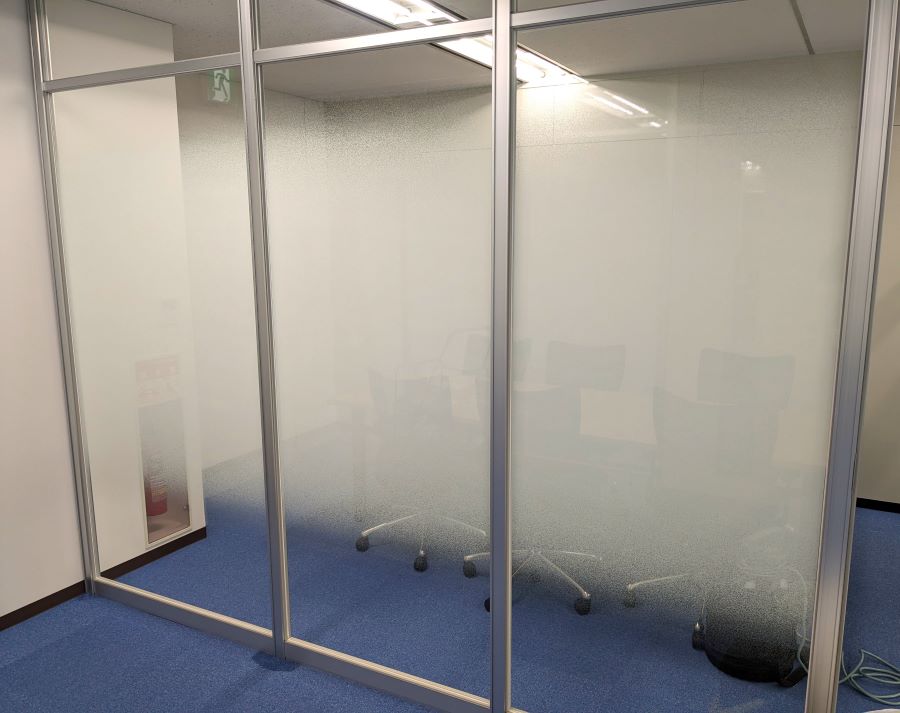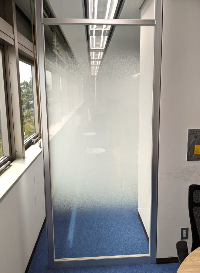 ‍新設オフィスのパーテーションに、グラデーションタイプの目隠しフィルムを貼り付け施工。