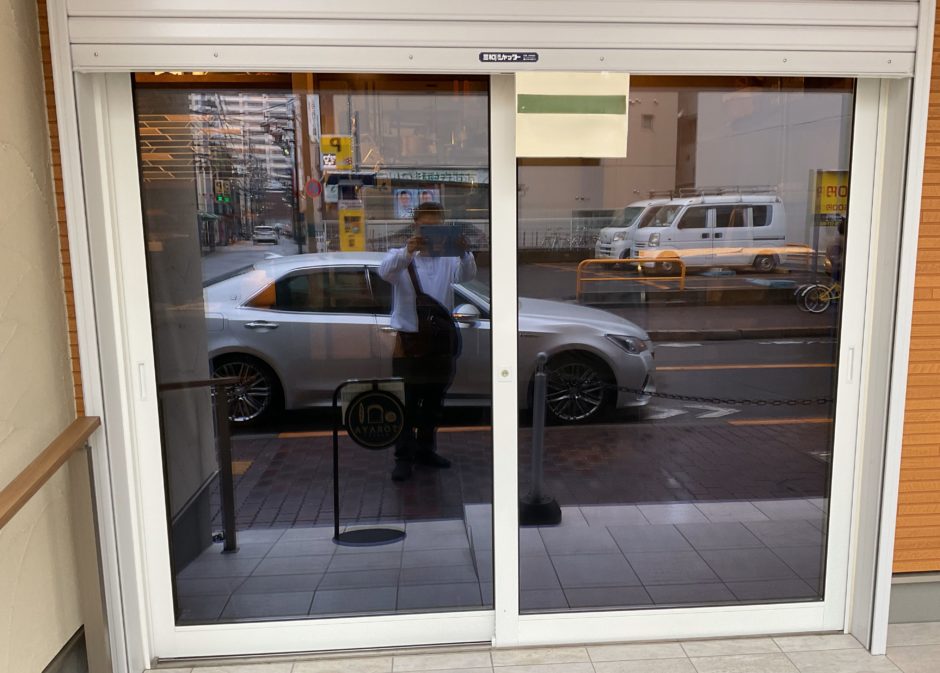 ‍ベーカリーの入り口窓にグラデーションタイプの目隠しフィルムを貼り付け施工。