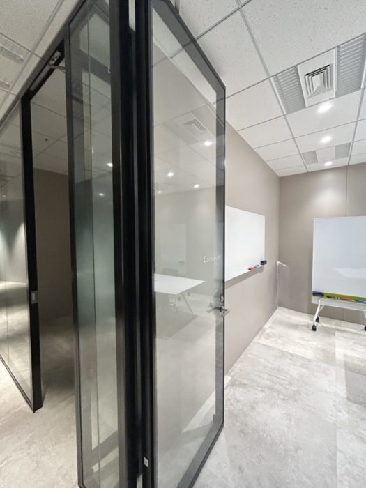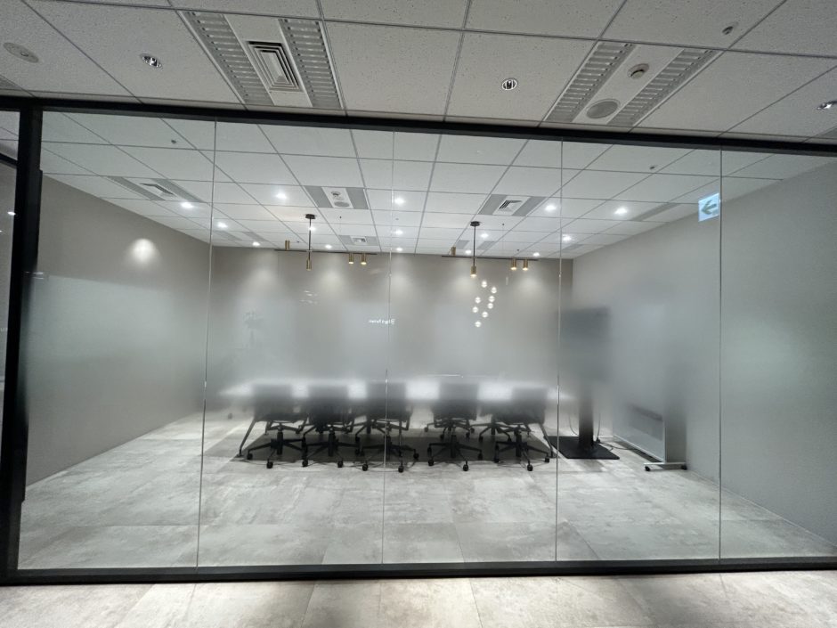 ‍オフィスのガラスパーテーションにグラデーションタイプの目隠しフィルムを張り付け施工。