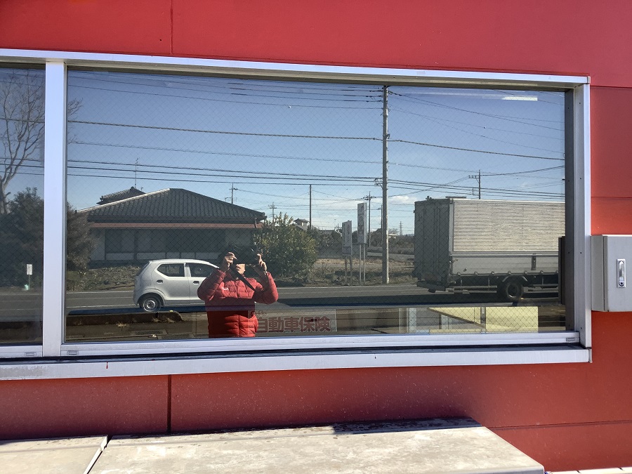 ‍店舗事務所の窓にマジックミラータイプの目隠しフィルムを貼り付け。