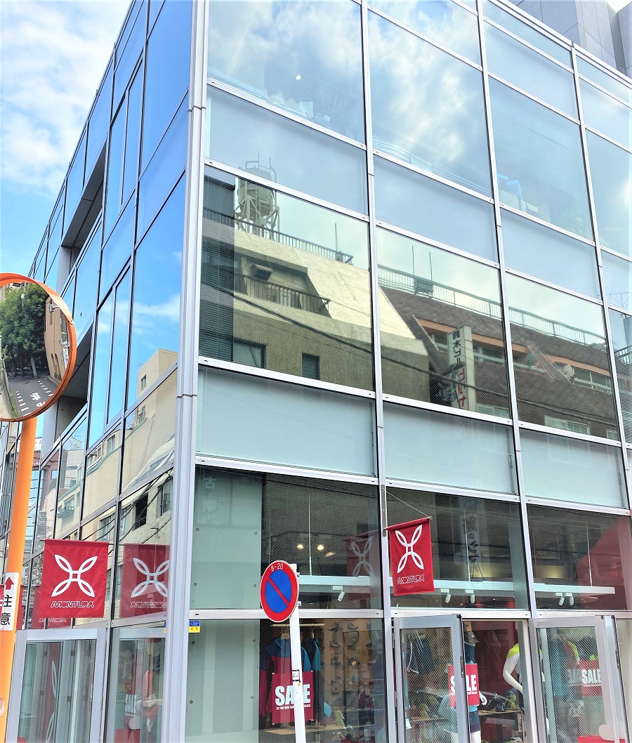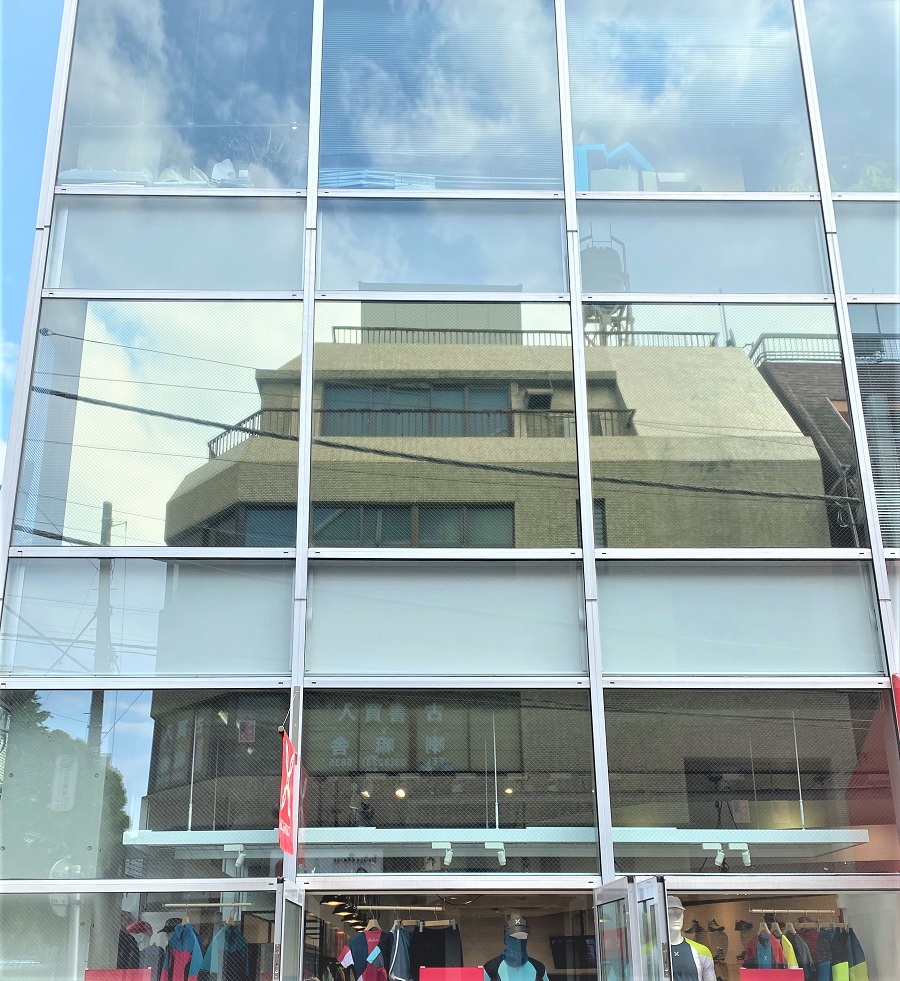 ‍ガラス張りのデザインのビル。施工個所の2階部分はミラーのような見え方になっています。