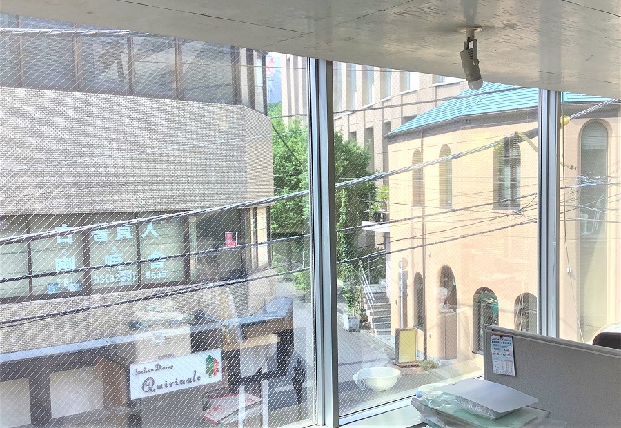 ‍ビル2階のオフィス窓にマジックミラータイプの目隠しフィルムを貼付。