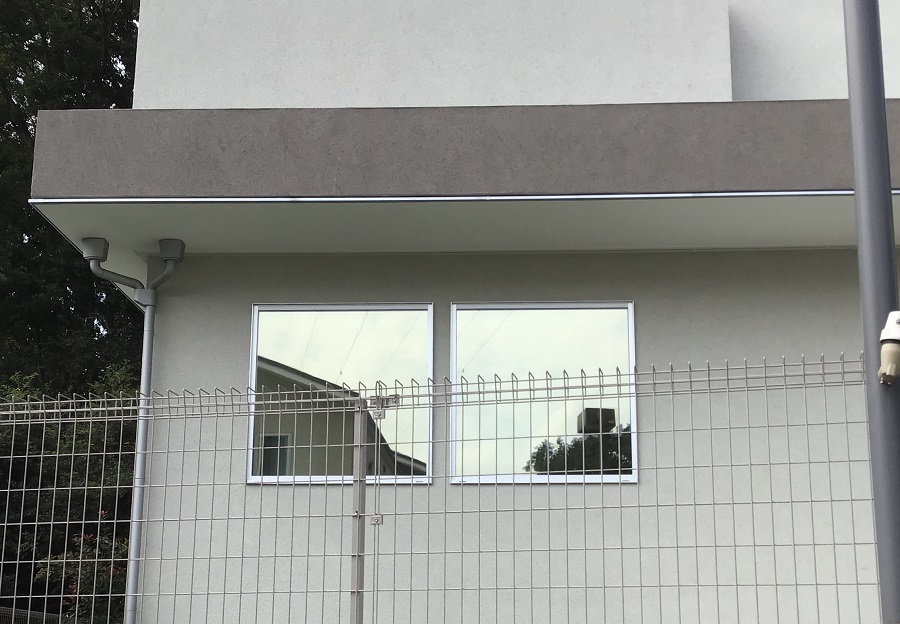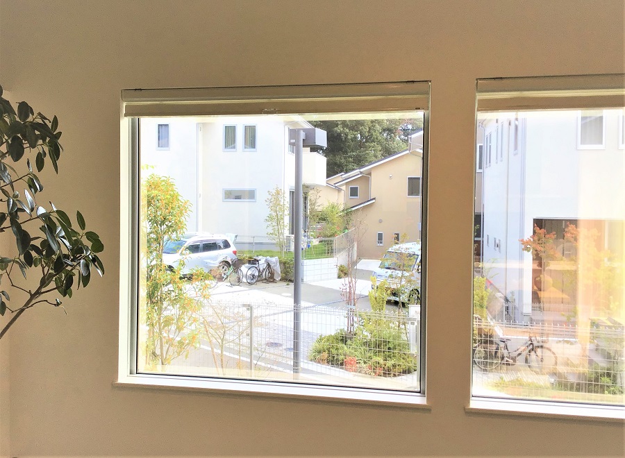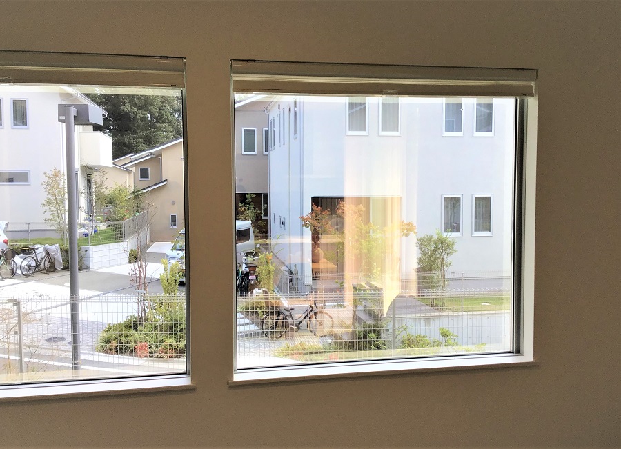 ‍住宅居室の窓にマジックミラータイプの目隠しフィルムを貼り付け。