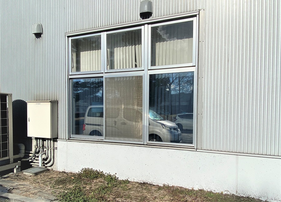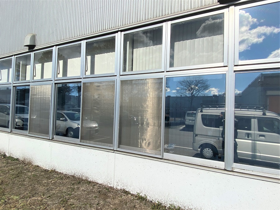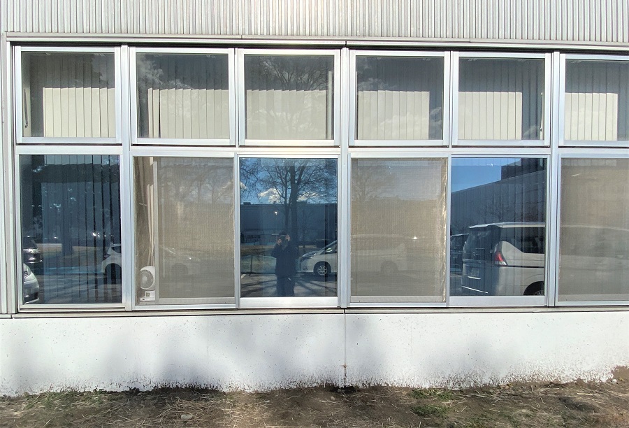 ‍施設の窓にマジックミラータイプの目隠しフィルムを貼付け。