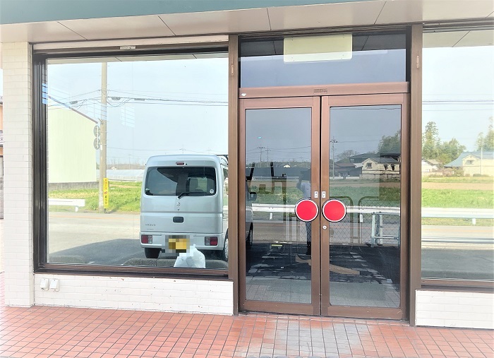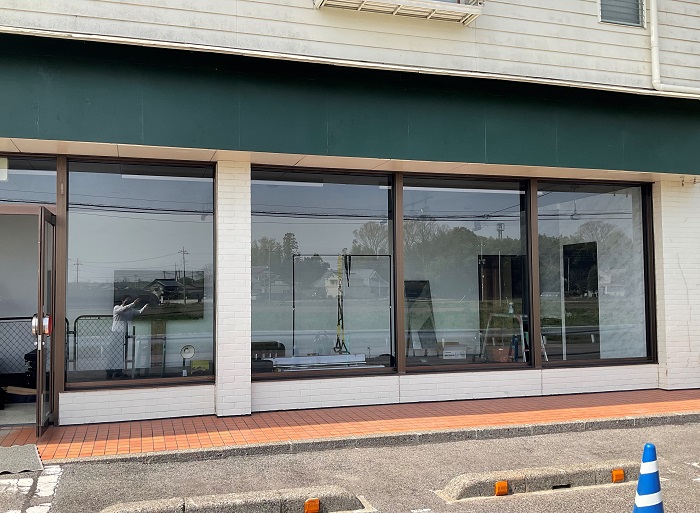 ‍施設の窓にマジックミラータイプの目隠しフィルムを貼付け。こちらは施工前の様子。