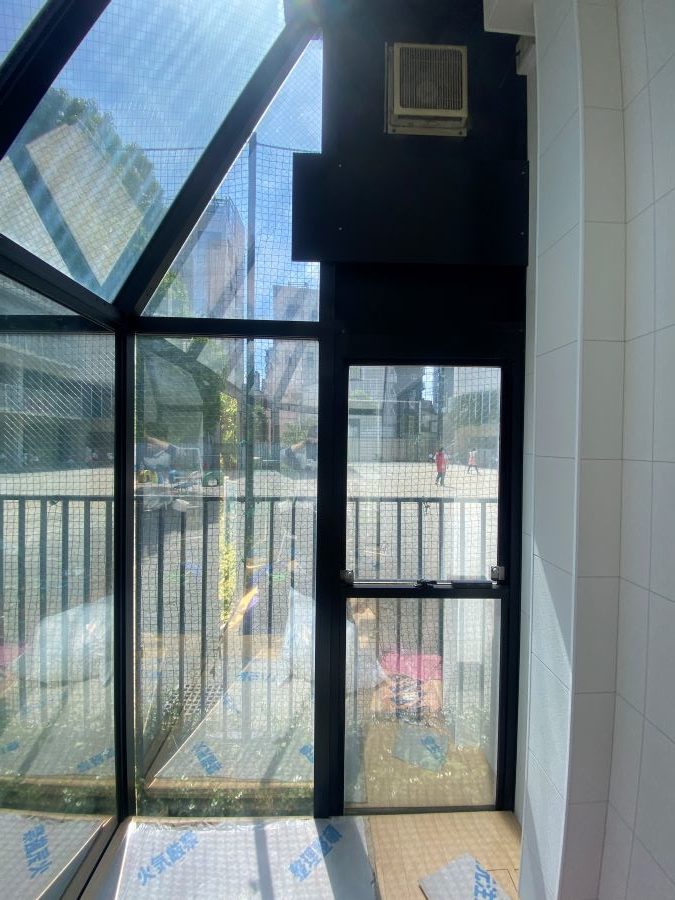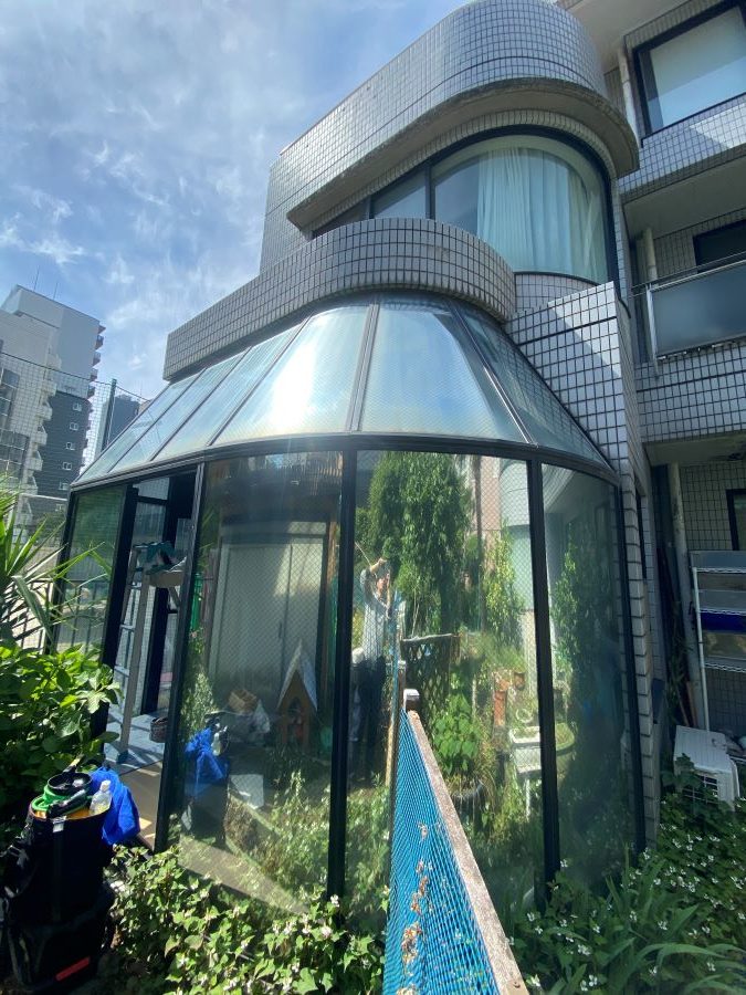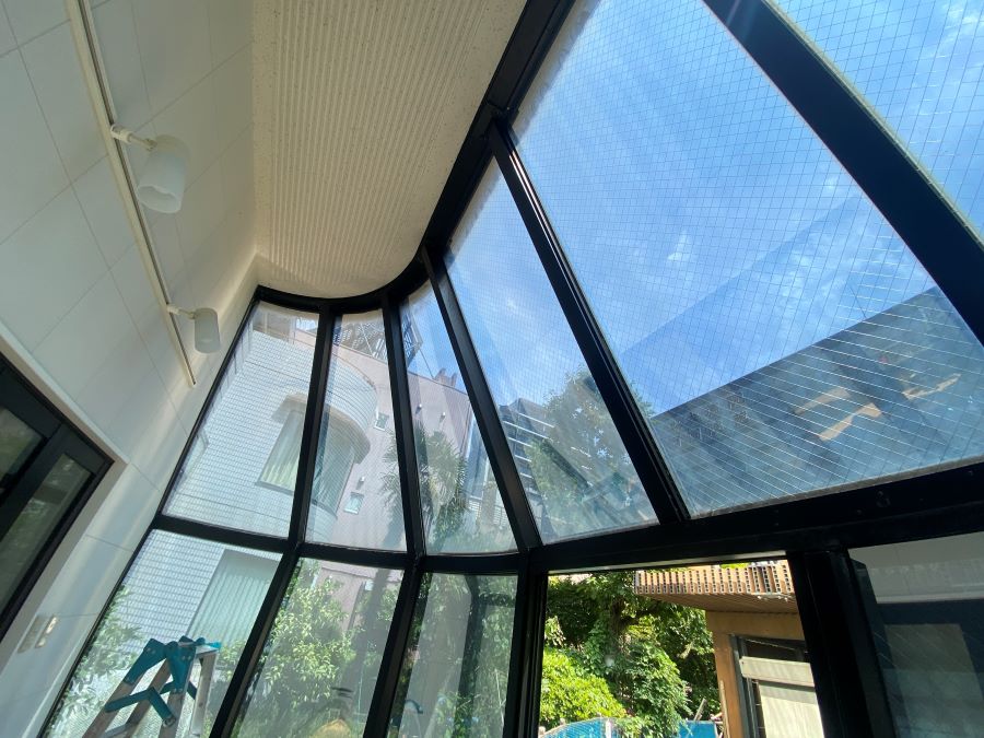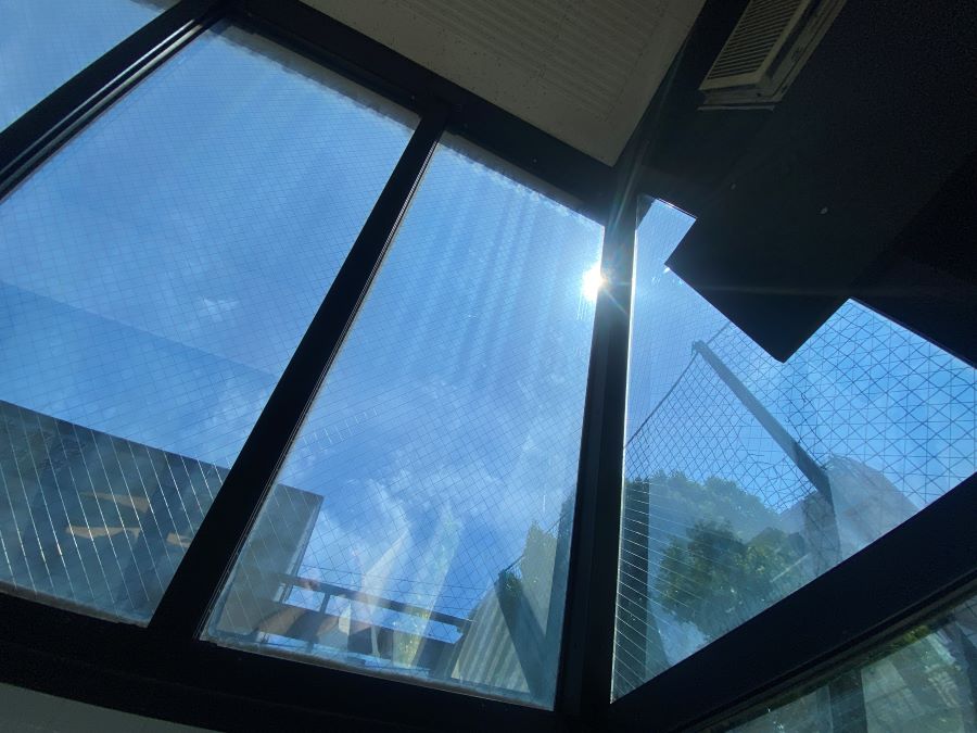 ‍施設のサンルーム部の窓にミラータイプの目隠しフィルムを貼り付け施工。