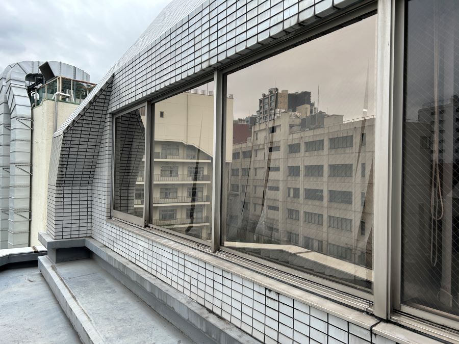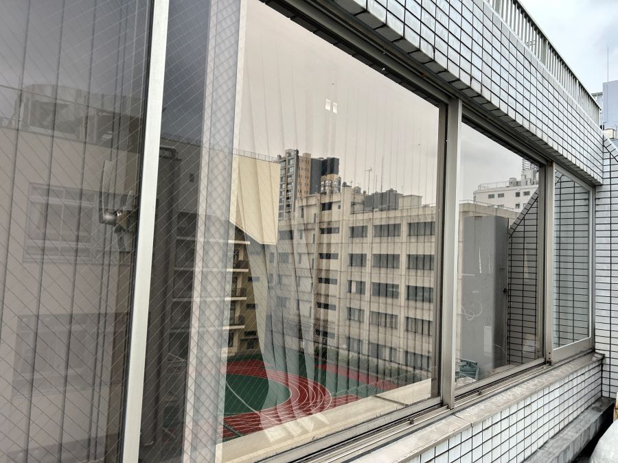 ‍施設窓にミラータイプの目隠しフィルムを貼り付け施工。