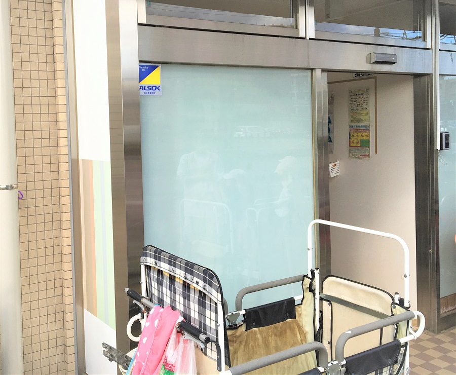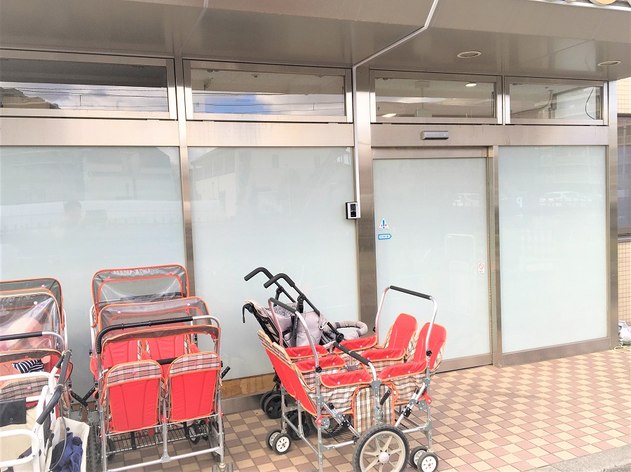 ‍保育施設入り口のドア、ガラス窓にミルキーミルキーを貼り付け。