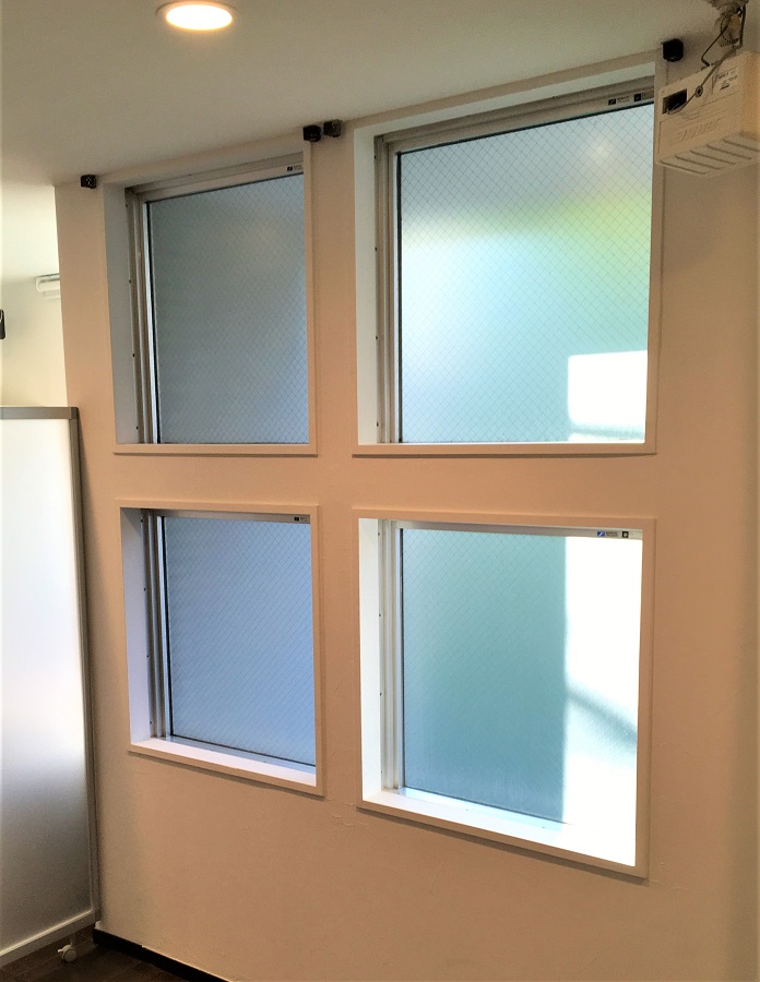 ‍施設の窓にスリガラス調の目隠しフィルムを貼付け。