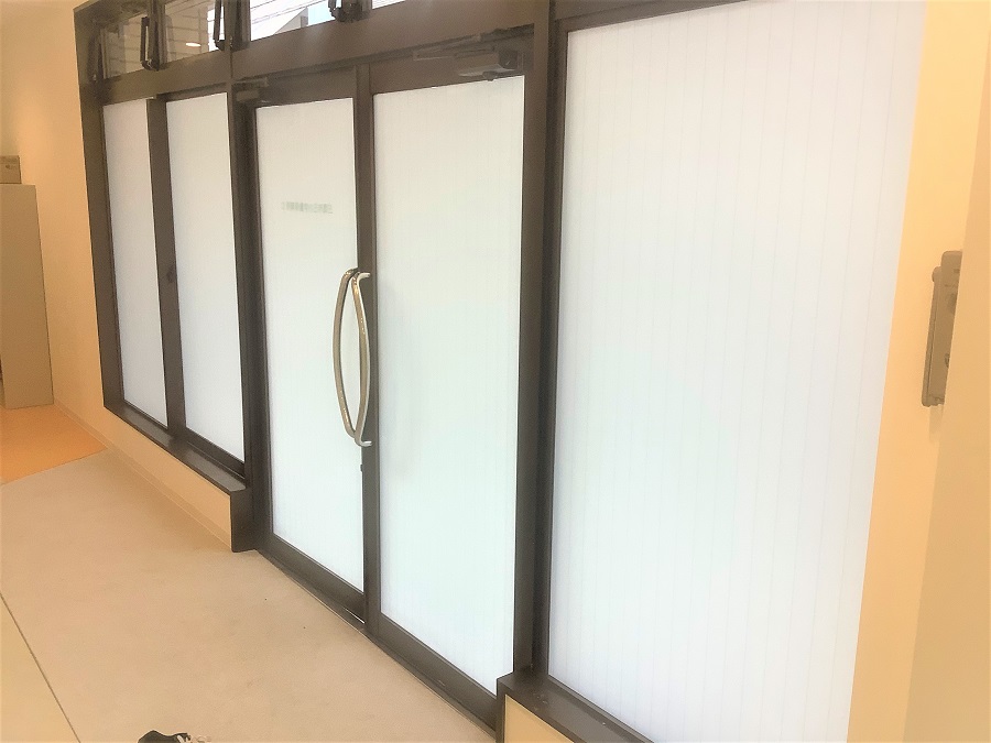 ‍施設路面側のガラス部分にスリガラスタイプの目隠しフィルムを貼付け。