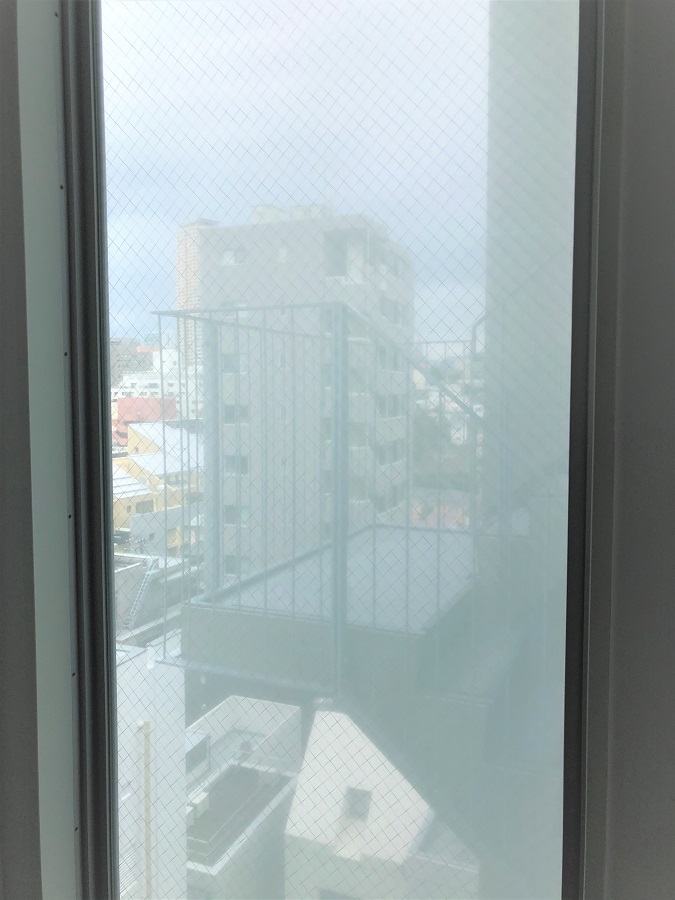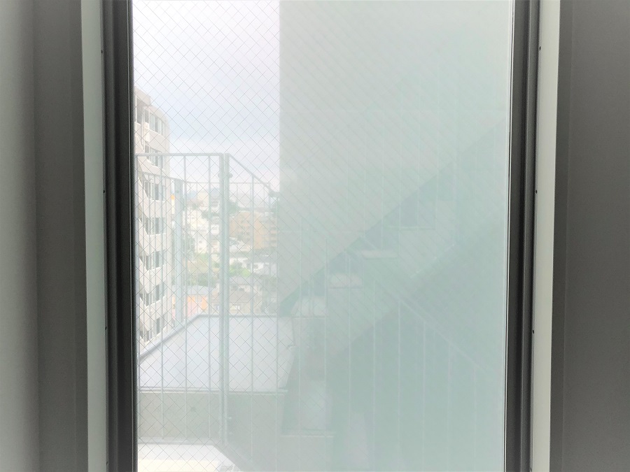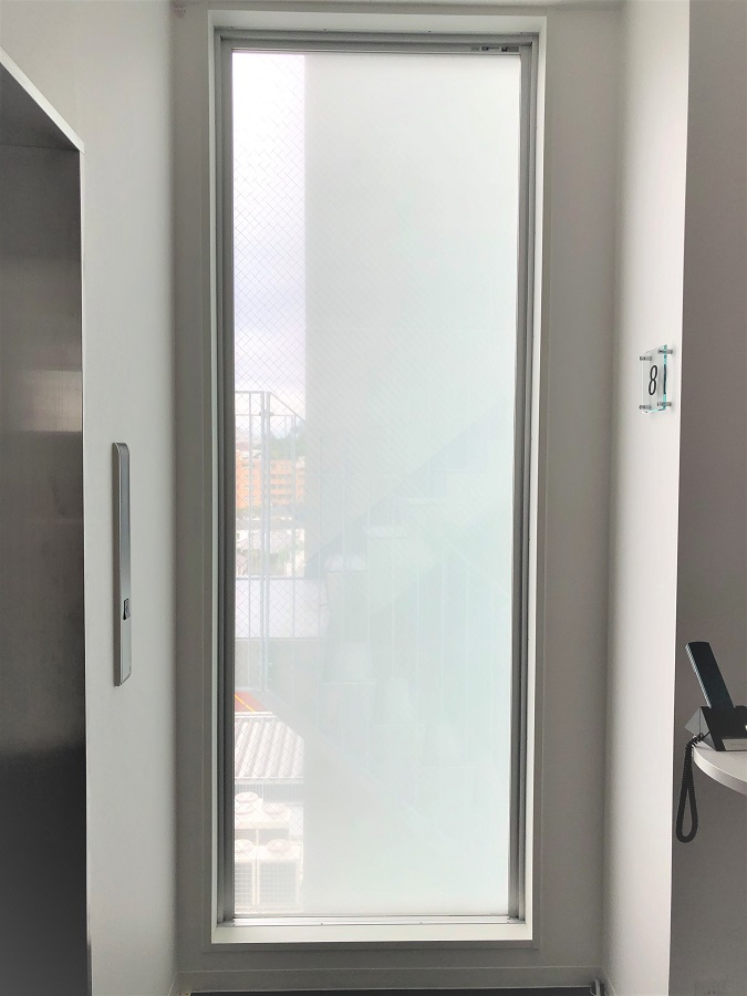 ‍施設のフィクス窓ガラスにスリガラスタイプの目隠しフィルムを貼付け。