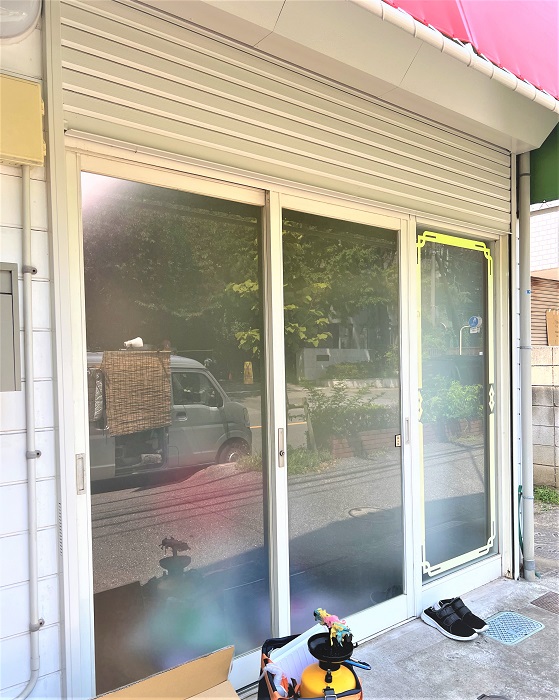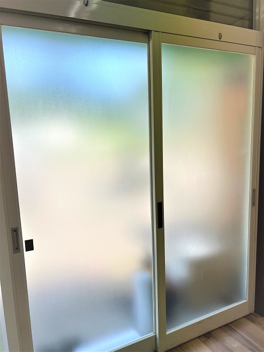 ‍店舗の窓にスリガラスタイプの目隠しフィルムを貼付け。