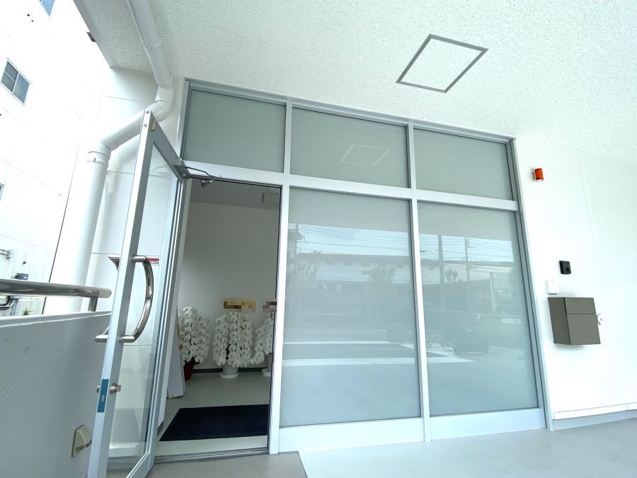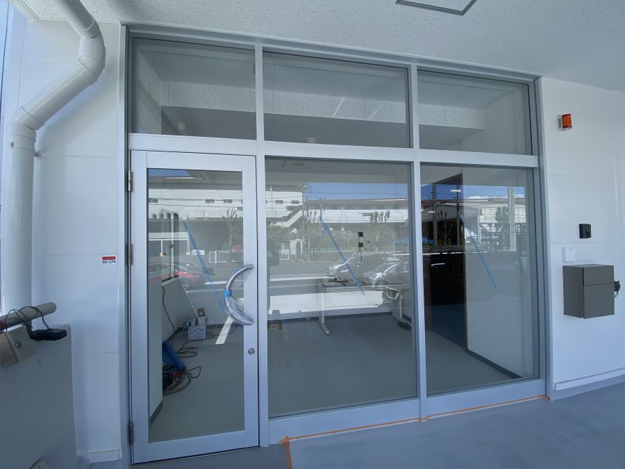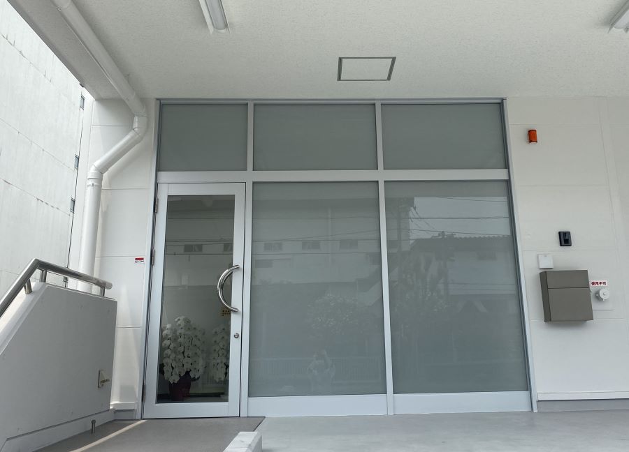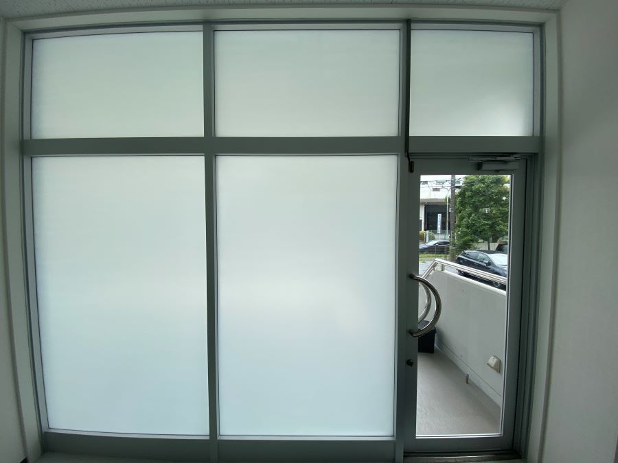 ‍施設入り口のガラスにスリガラスタイプの目隠しフィルムを貼付け。