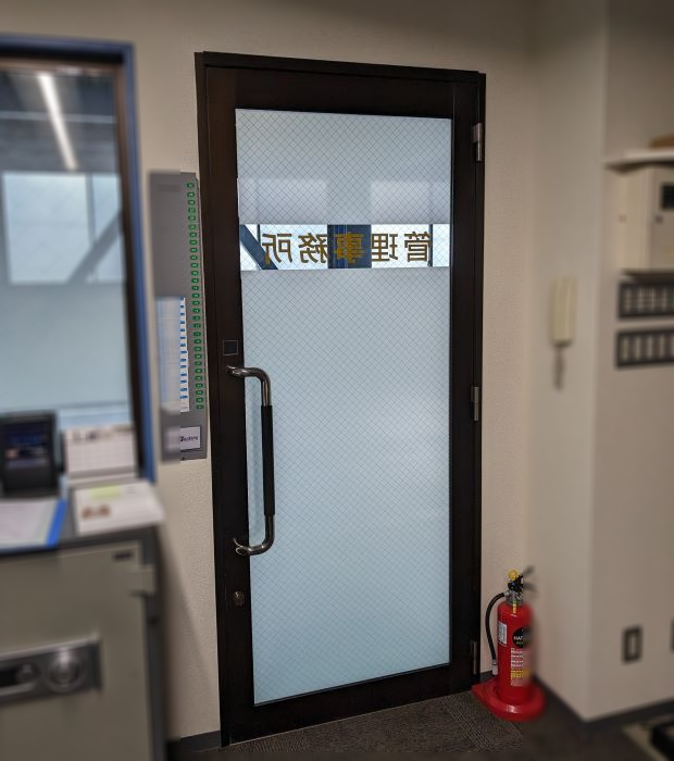 ‍事務所のガラス扉に目隠しフィルムを貼り付け施工。