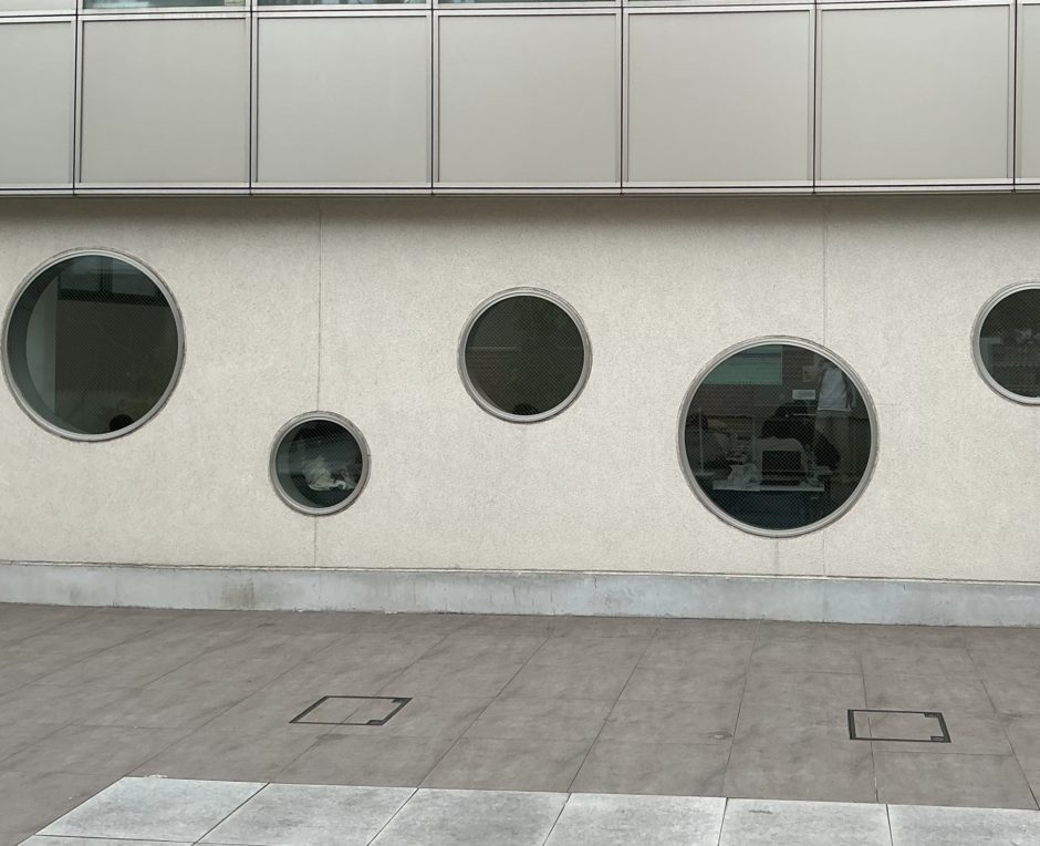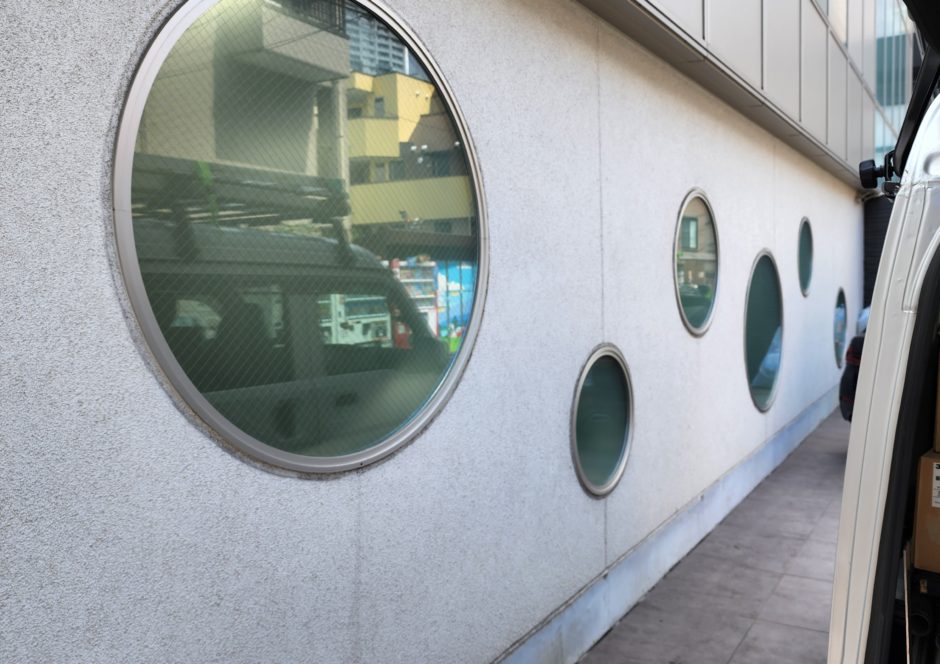 ‍円形の窓にスリガラスタイプの目隠しフィルムを張り付け施工。