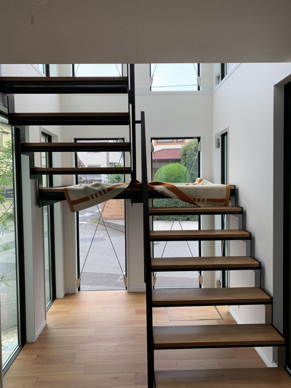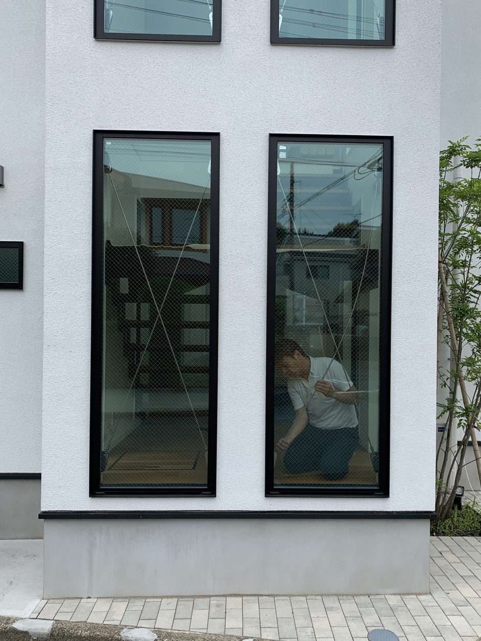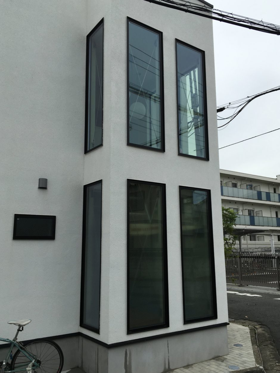 ‍施工後。スリガラスタイプの目隠しフィルムが貼ってある1階部分と貼っていない2階部分の差は歴然です。