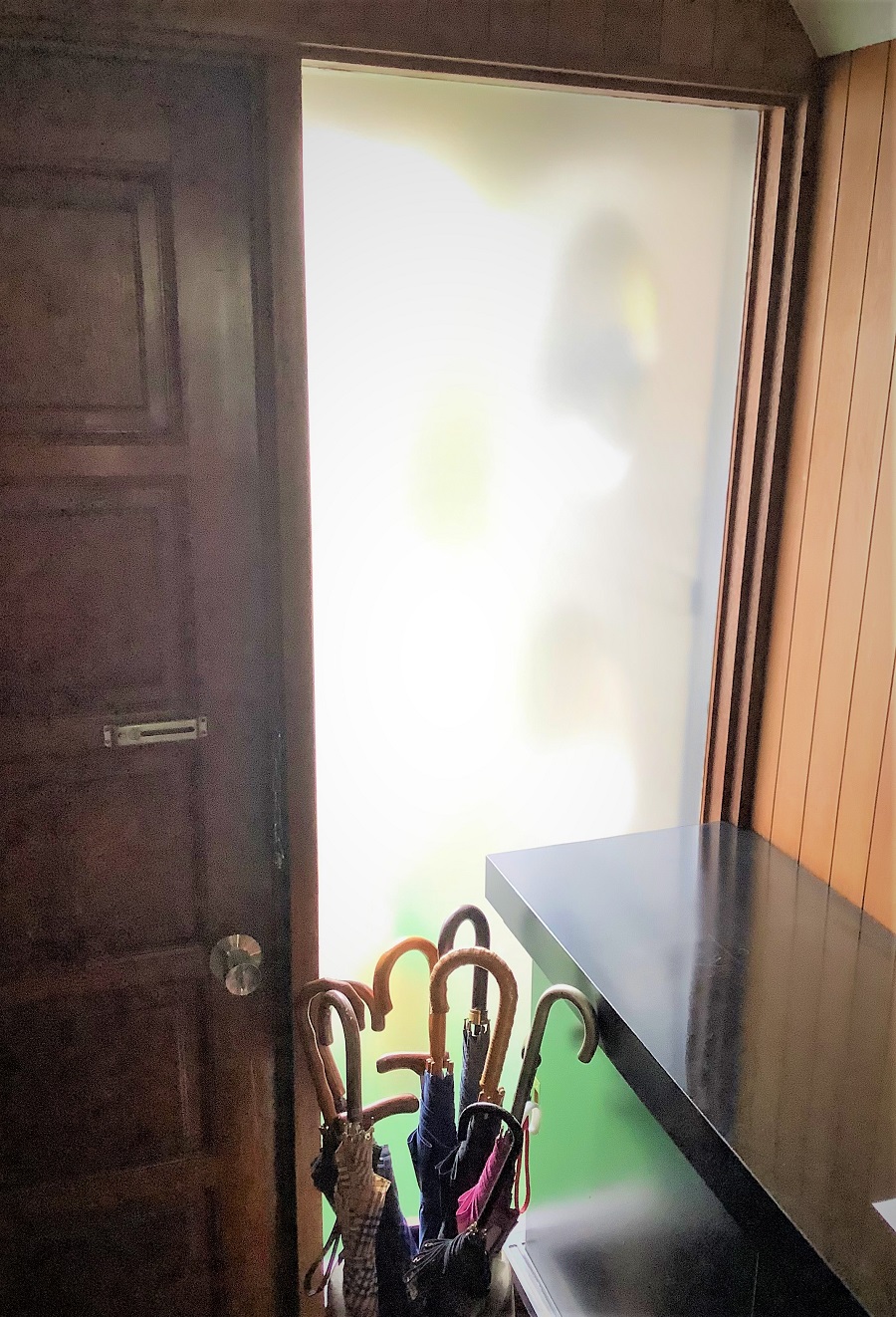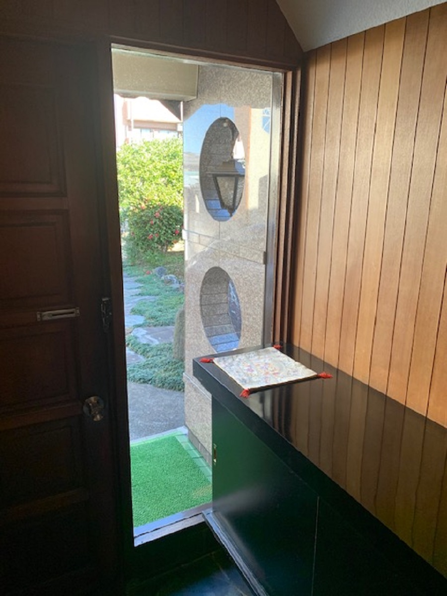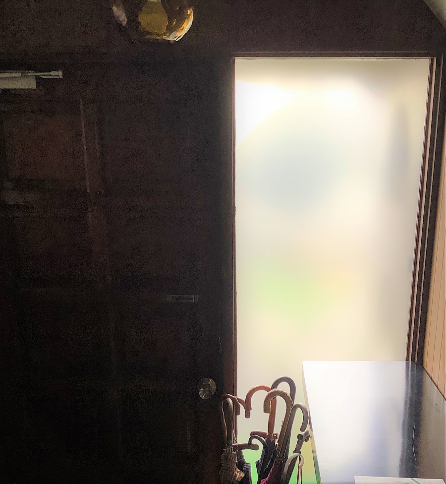 ‍玄関扉横のはめ込み窓に目隠しフィルムを貼付。