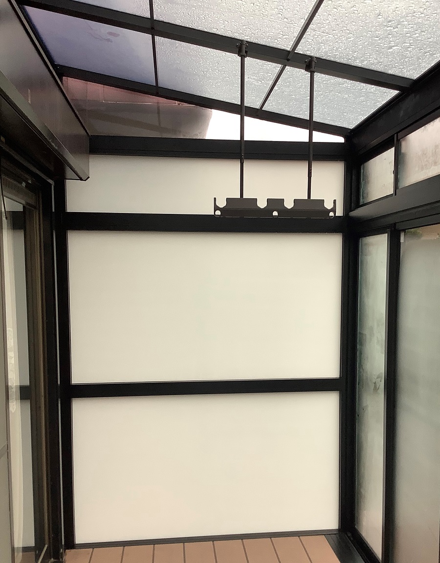 ‍サンルームのサイドガラスにスリガラス調の目隠しフィルムを貼り付け。