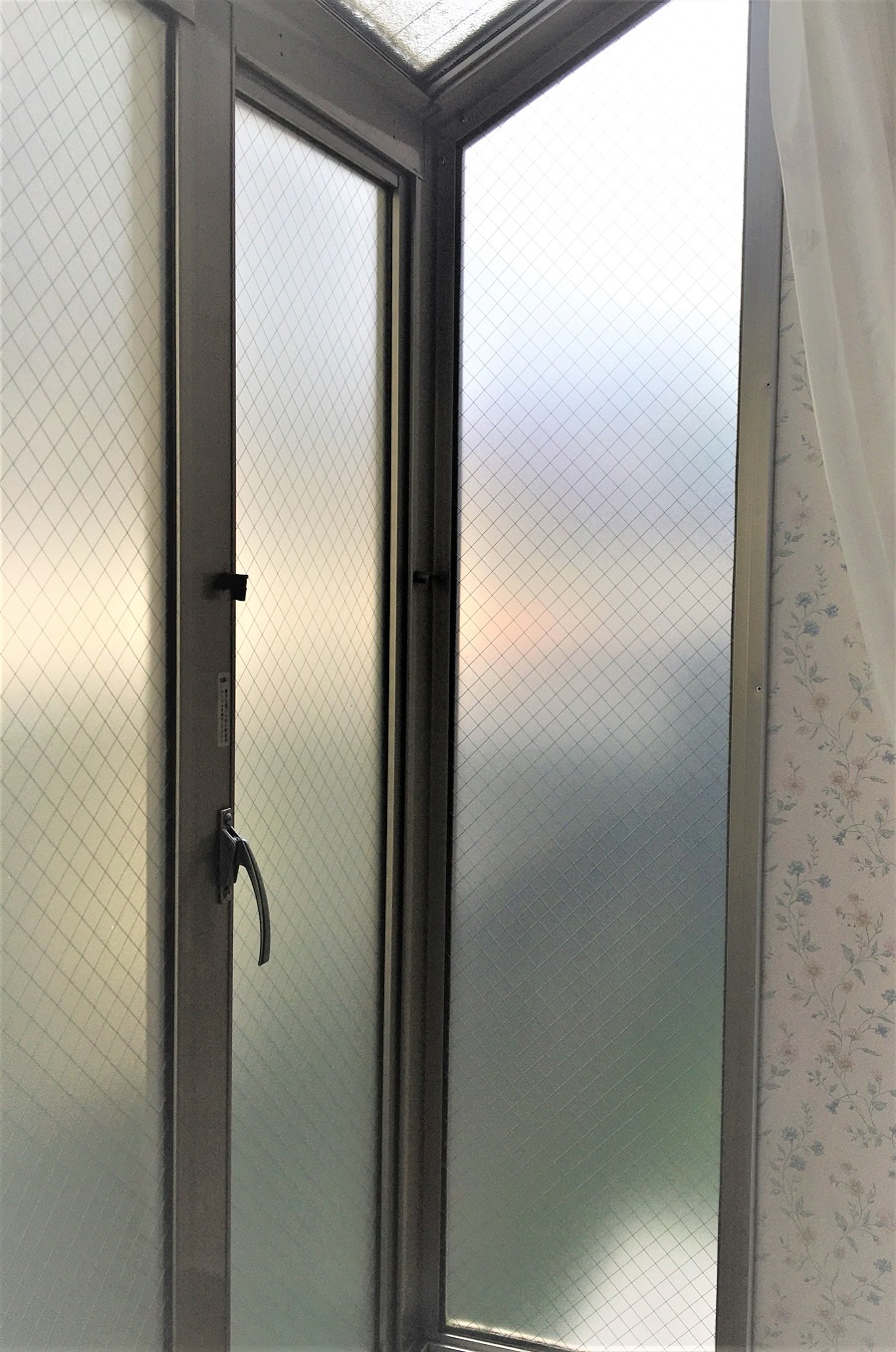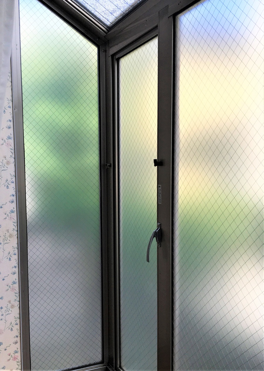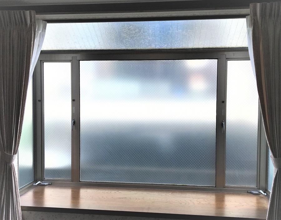 ‍居室の出窓にスリガラスタイプの目隠しフィルムを貼り付け。