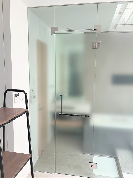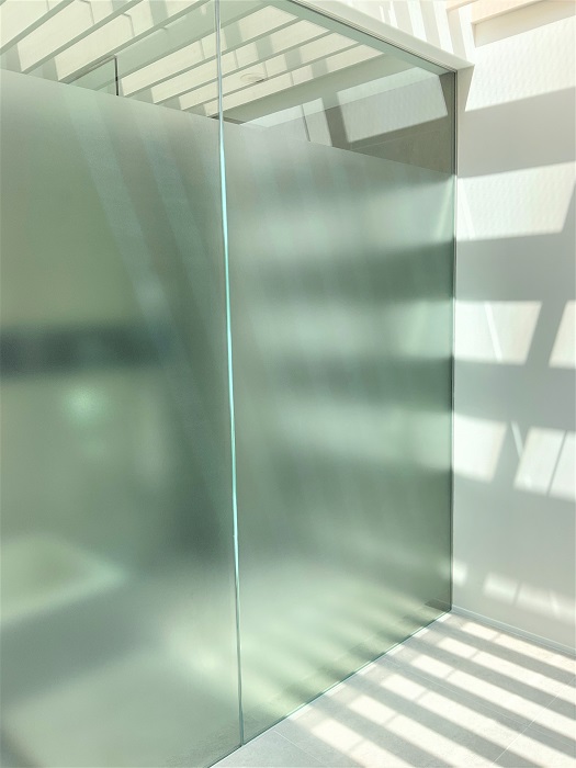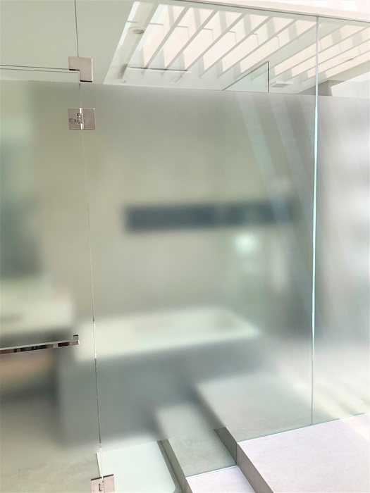 ‍バスルームのガラスの壁面にスリガラスタイプの目隠しフィルムを貼付け。