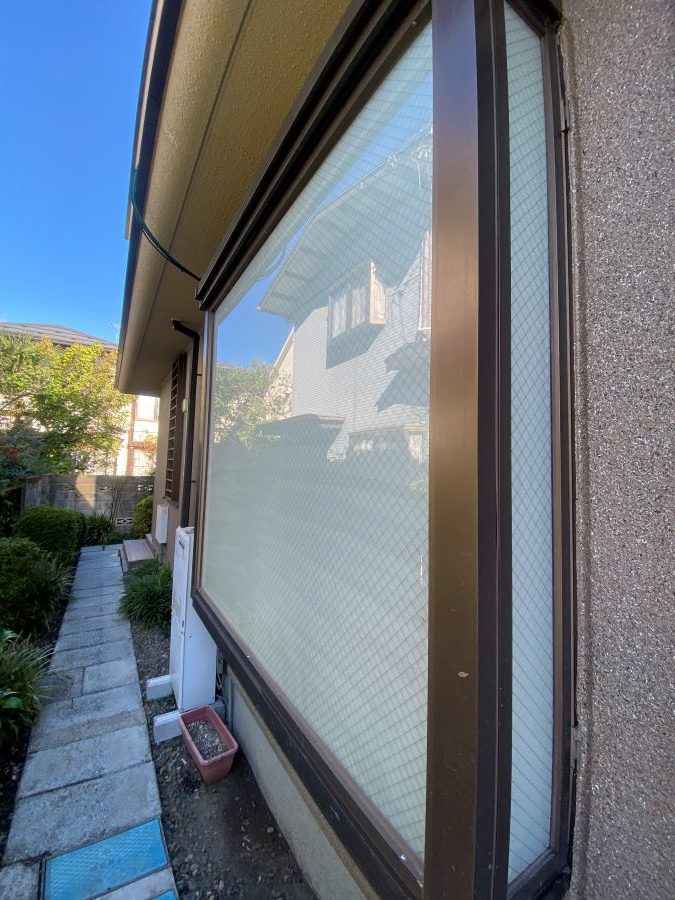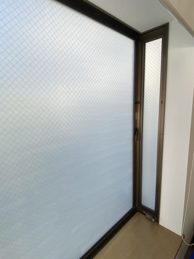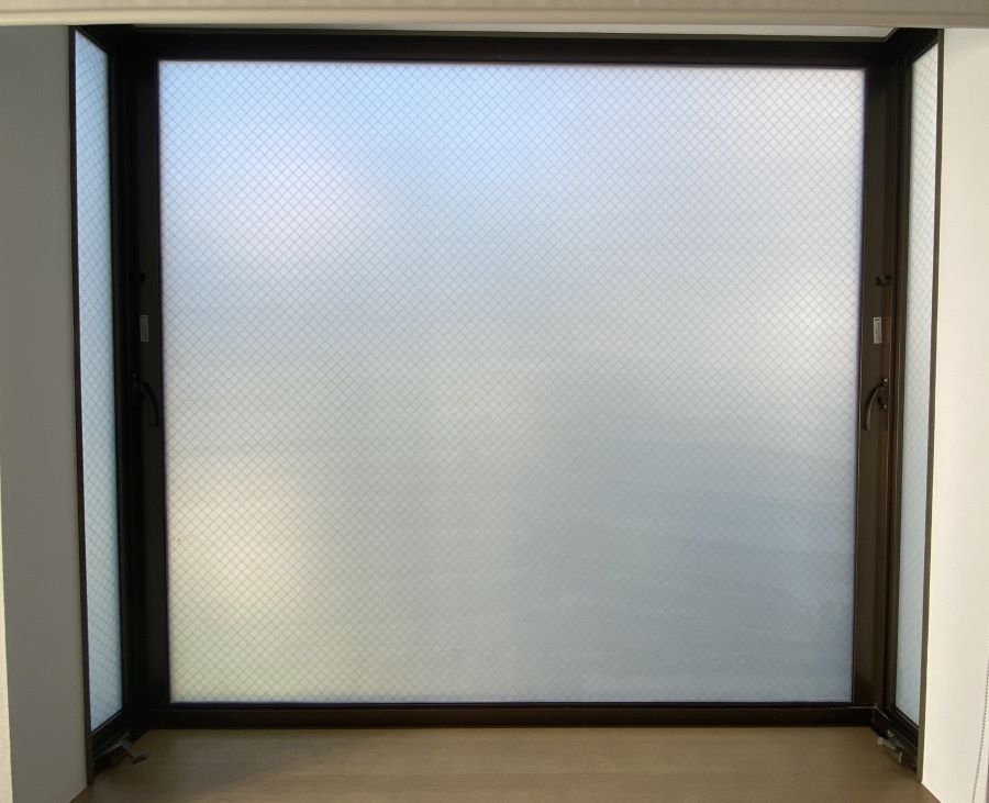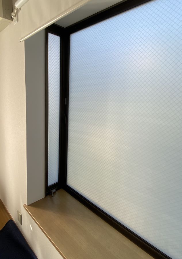 ‍戸建て住宅居室の窓にスリガラスタイプの目隠しフィルムを貼付け。