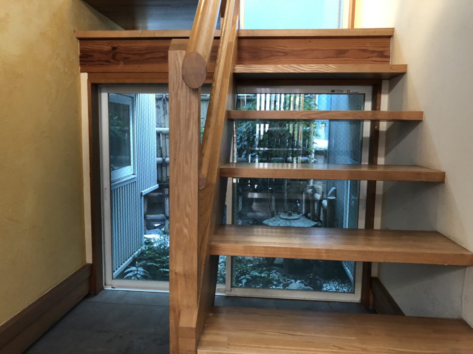‍階段下の右側からは窓が曇ったように、中庭の趣の邪魔になる建物が見えなくなります。