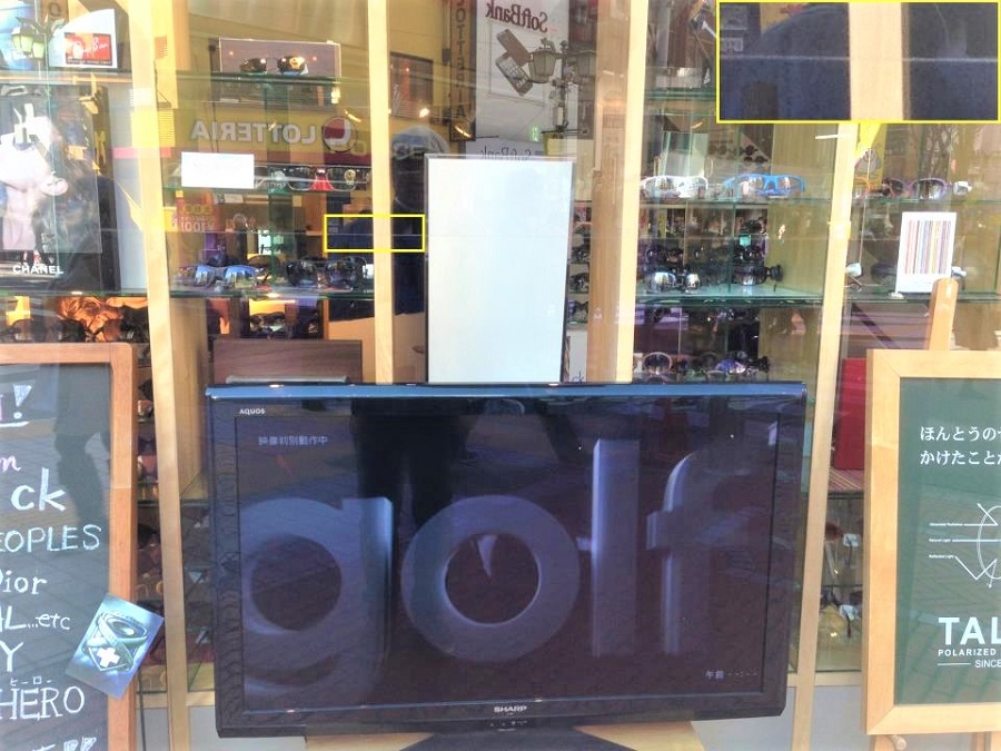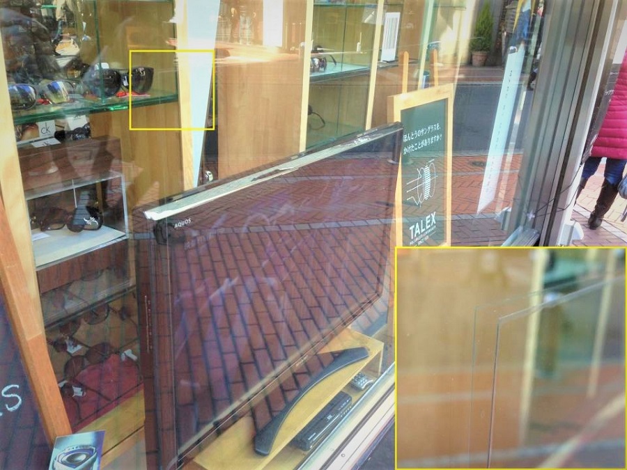 ‍店舗のテレビの前のディスプレイ窓に反射防止フィルムを貼り付け。