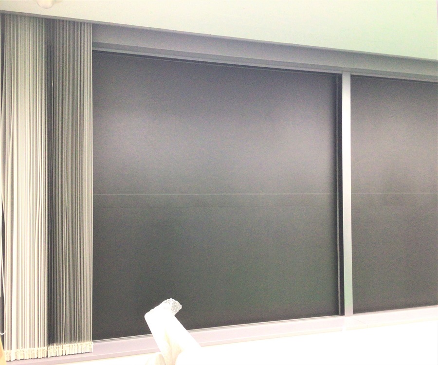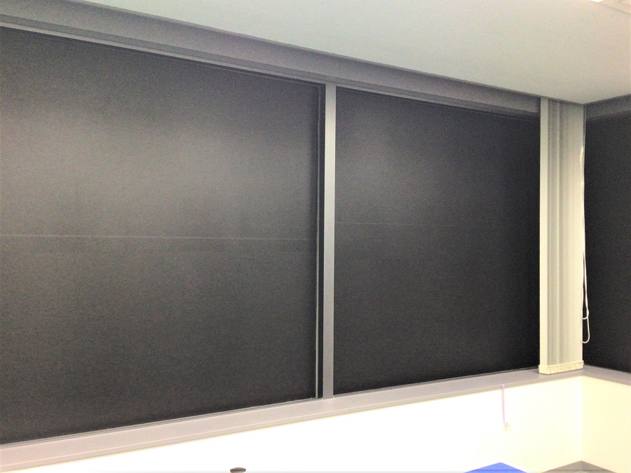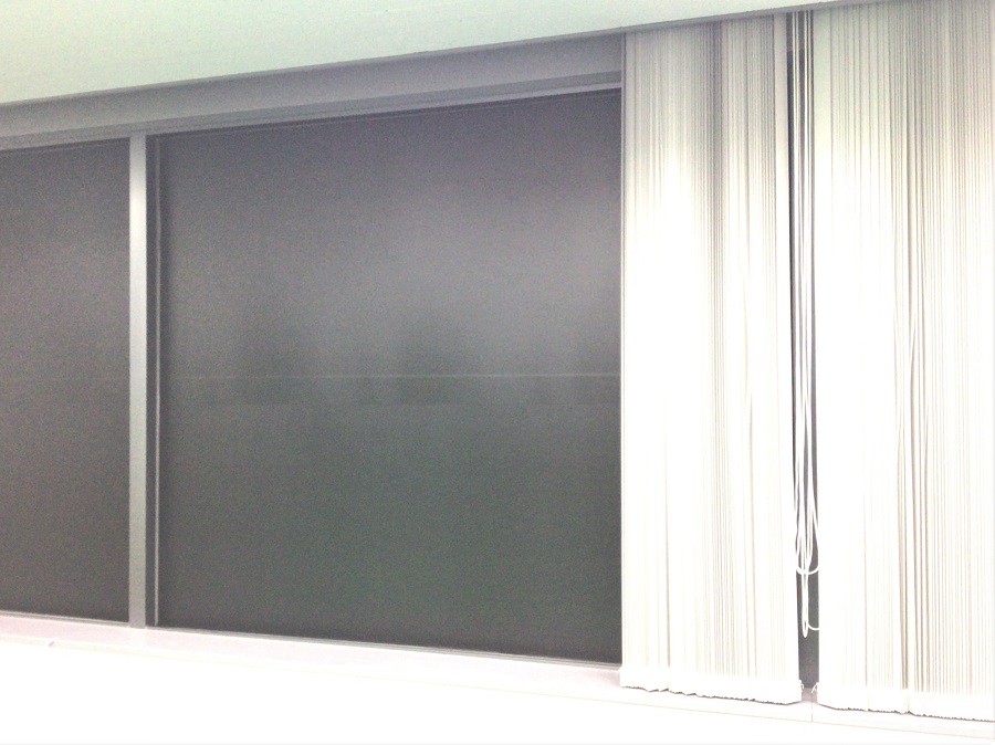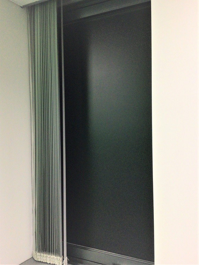 ‍施設内の窓に遮光シートを貼付け。